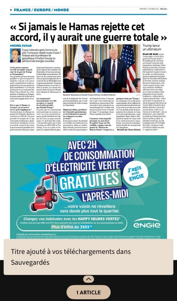 Midi Libre – 1er octobre 2025 – Plan de Donald Trump pour Gaza : “Si jamais le Hamas rejette cet accord, il y aurait une guerre totale”, estime l’expert Michel Fayad